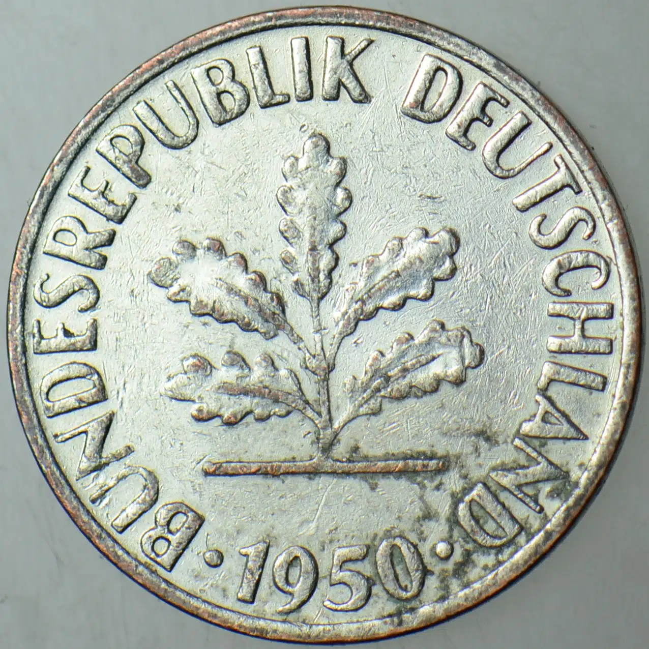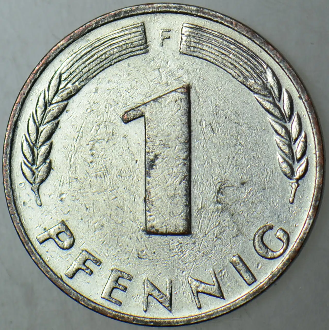 Etiketler | ALMANYA 1 PFENNİG 1950 F. FARKLI RENK-KAPLAMA. |